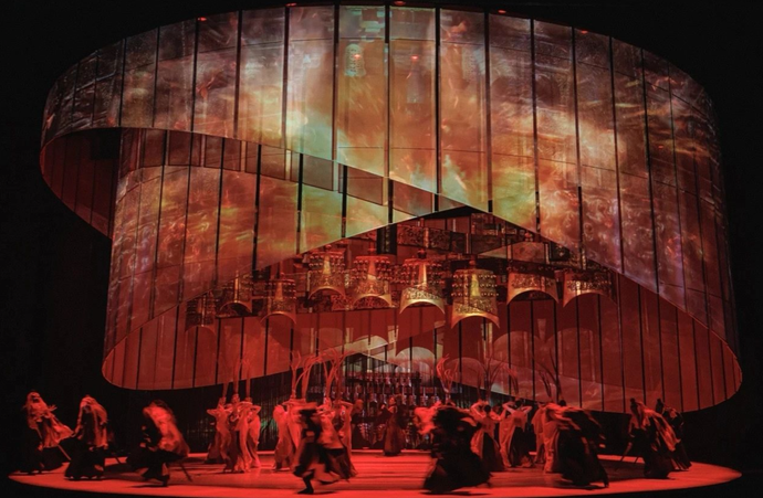 演出開始,竹簡如歷史長卷般緩緩展開、收縮,演員們穿梭其間,在精妙的燈光設(shè)計下,深紫色渲染出宮廷的神秘幽影,血紅色隱喻著戰(zhàn)爭的殘酷硝煙,隱約的綠意象征著和平的希望,層層鋪陳。結(jié)合環(huán)形舞臺360度旋轉(zhuǎn)與頂投、背投等多維度投影技術(shù),打造出時空交錯的蒙太奇效果,賦予觀眾獨(dú)特的“上帝視角”,使其完全沉浸于劇情之中,仿佛親身經(jīng)歷那段波瀾壯闊的歷史。