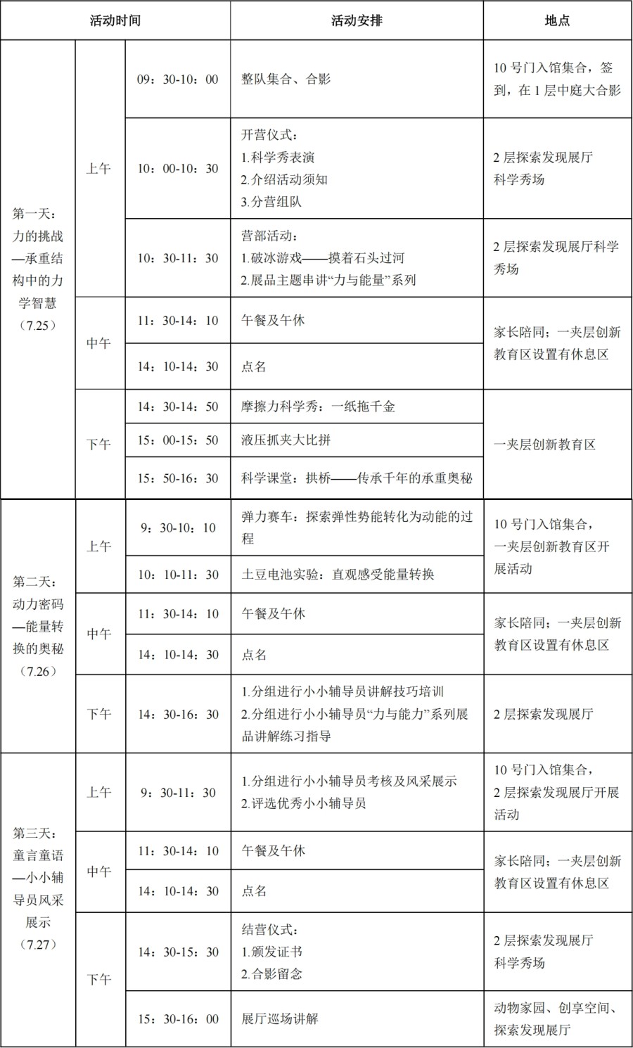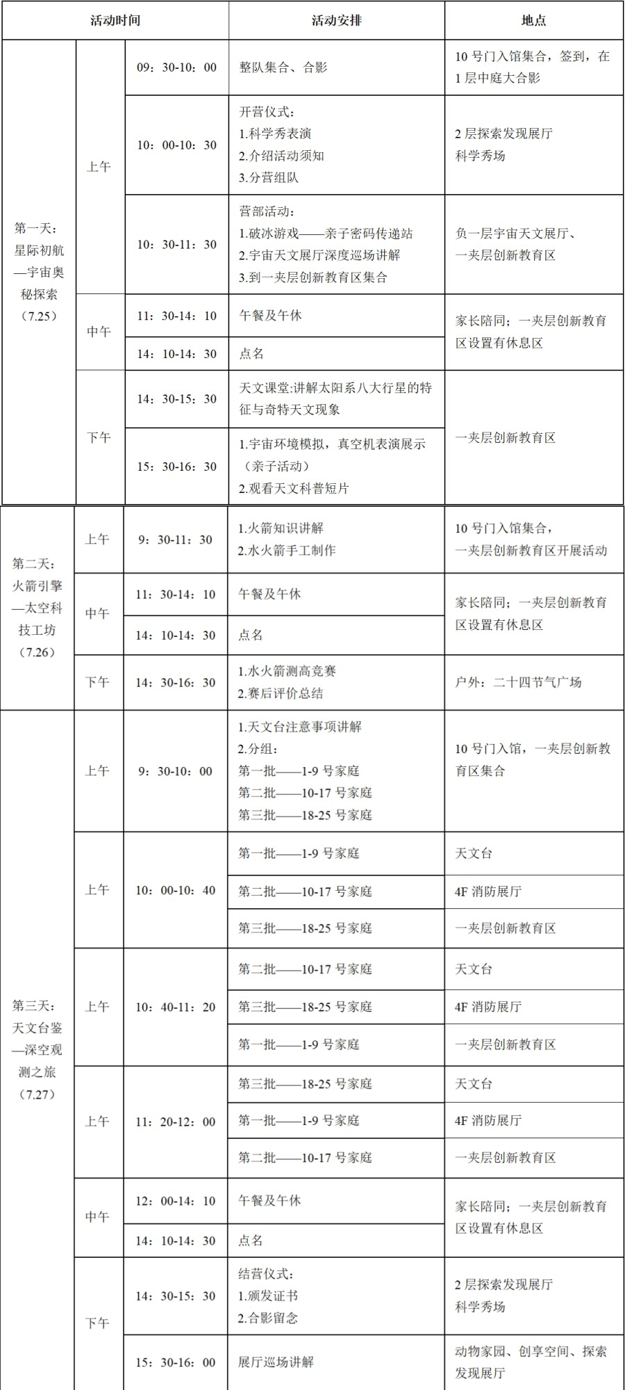 本次夏令營活動(dòng)免費(fèi),共開放50組家庭名額。一營25組家庭面向公眾招募;二營15組家庭面向省科技館館校合作校,10組家庭面向往屆“小小輔導(dǎo)員”招募。每組家庭限一個(gè)成人和一個(gè)兒童,餐飲費(fèi)用需參與家庭自理。