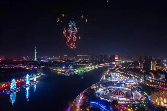 從紅楓廣場到銀灘,河堤兩岸的人流如織成線,串聯(lián)起一個(gè)個(gè)驚喜點(diǎn)位。梨園茶社里,三五好友臨岸而坐,伴著豫劇唱腔閑談趣事;河畔咖啡座上,年輕人對(duì)著河景暢想未來,愁云瑣事皆隨河波漾開。沙澧河不再是單純的景觀,更成了融合“空中展演+地面互動(dòng)+消費(fèi)體驗(yàn)”的立體舞臺(tái),讓“夜游郾城”成為新風(fēng)尚。