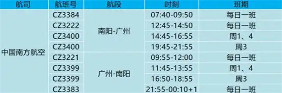 8月4日至8月28日,南陽至廣州航線每周一、三、四各新增1班,由中國南方航空公司執(zhí)飛,機(jī)型為C909。