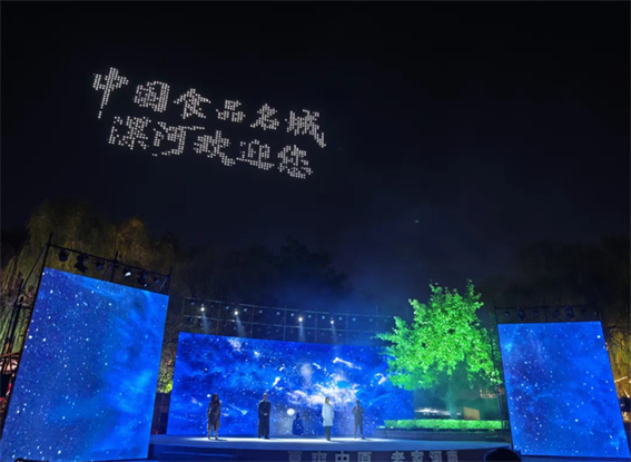 《食源·漯河》節(jié)目將現(xiàn)場氣氛推向高潮,無人機燈光場景變幻與演員演繹隔空交互,從遠古賈湖先民的農(nóng)耕創(chuàng)造,到許慎說文解字的嚴謹詮釋,再到科技范兒的商貿(mào)交融……通過一路時空溯源,展現(xiàn)當?shù)匚幕c城市的“食尚”活力。