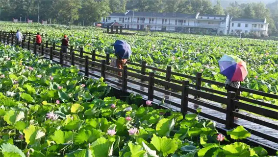 盛夏七月,新縣郭家河鄉(xiāng)大別山紅廉文化園的荷塘迎來了盛花期。青綠的荷葉層層疊疊,粉紅、潔白的荷花從葉間挺立出來,花瓣舒展,露出嫩黃的花蕊。棧道上,游人絡(luò)繹不絕,賞荷拍照,怡然自得。