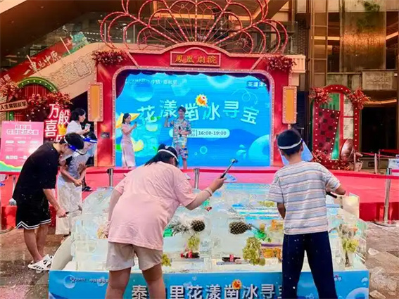在印巷1923街區(qū)的“花漾吃瓜大賽”活動(dòng)趣味十足,套西瓜、蒙眼吃瓜、西瓜涂鴉等環(huán)節(jié)吸引眾多游客駐足參與,現(xiàn)場(chǎng)笑聲不斷,妙趣橫生。在“花漾鑿冰尋寶”活動(dòng)現(xiàn)場(chǎng),不少大小朋友免費(fèi)挑戰(zhàn)1分鐘鑿冰! 鑿到啥就送啥,體驗(yàn)-5℃的清涼暴擊!此外,“花漾夢(mèng)幻泡泡秀”等活動(dòng)也即將在暑期清涼呈現(xiàn)。