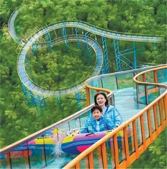 山風(fēng)攜帶蟬鳴,拂過河南魯山縣天龍池景區(qū)。一條蜿蜒的玻璃漂流滑道宛如“水晶巨龍”,盤旋于蔥郁的樹林之間。“嗖——”皮艇在滑道中順流而下,游客的尖叫與歡笑聲回蕩在山谷。