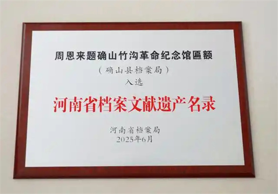 為扎實(shí)開(kāi)展第二批河南省檔案文獻(xiàn)遺產(chǎn)申報(bào)工作,在確山縣文廣旅局、竹溝革命紀(jì)念館的通力配合下,近日,確山縣申報(bào)的《周恩來(lái)題確山竹溝革命紀(jì)念館匾額》入選第二批河南省檔案文獻(xiàn)遺產(chǎn)名錄。