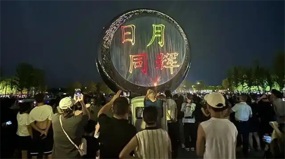 日月同輝雕塑前,人頭攢動(dòng)、熱鬧非凡,前來(lái)觀賞的市民游客紛紛拍照錄像,記錄景區(qū)光影交織、流光溢彩的“高光時(shí)刻”。正值暑期的孩子們?cè)谌巳褐袣g呼雀躍,深深沉浸在這充滿奇幻與浪漫的氛圍中。