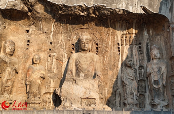 奉先寺內(nèi),盧舍那大佛莊嚴(yán)肅穆 。人民網(wǎng) 宋芳鑫 攝