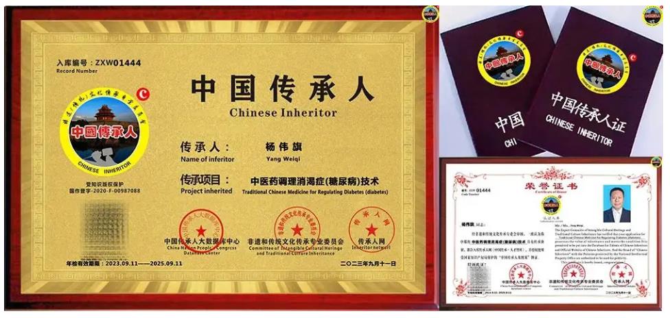 2023年9月,經(jīng)中國傳承人大數(shù)據(jù)庫中心非遺和傳統(tǒng)文化傳承專業(yè)委員會審核,認為河南省開封市楊偉旗同志申報的“中醫(yī)藥調(diào)理消渴癥(糖尿病)技術(shù)”具有傳承價值,符合申報條件,準(zhǔn)許入庫傳承人網(wǎng)《中國傳承·人才智庫》,并授權(quán)使用受知識產(chǎn)權(quán)保護“中國傳承人及圖”牌證。