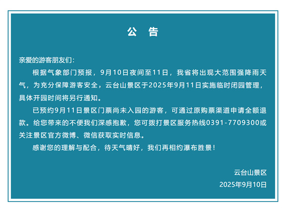 云臺(tái)山景區(qū)于2025年9月11日實(shí)施臨時(shí)閉園管理,具體開園時(shí)間將另行通知 。