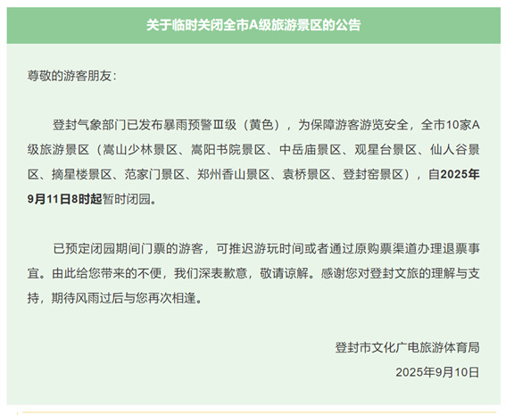 登封全市10家A級(jí)旅游景區(qū)(嵩山少林景區(qū)、嵩陽書院景區(qū)、中岳廟景區(qū)、觀星臺(tái)景區(qū)、仙人谷景區(qū)、摘星樓景區(qū)、范家門景區(qū)、鄭州香山景區(qū)、袁橋景區(qū)、登封窯景區(qū)),自2025年9月11日8時(shí)起暫時(shí)閉園。