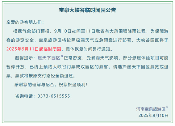 接上級(jí)通知,由于近期天氣惡劣多變,我縣于中午12:30啟動(dòng)防汛三級(jí)應(yīng)急響應(yīng),為確保廣大游客生命財(cái)產(chǎn)安全,自2025年9月10日12:30起, 郟縣三蘇園景區(qū)臨時(shí)閉館。