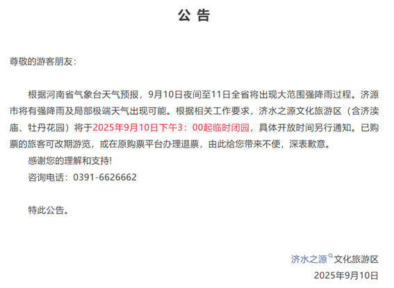 根據(jù)相關(guān)工作要求,濟(jì)水之源文化旅游區(qū)(含濟(jì)瀆廟、牡丹花園)將于2025年9月10日下午3:00起臨時(shí)閉園,具體開放時(shí)間另行通知。已購票的旅客可改期游覽,或在原購票平臺(tái)辦理退票。