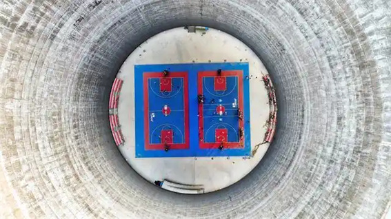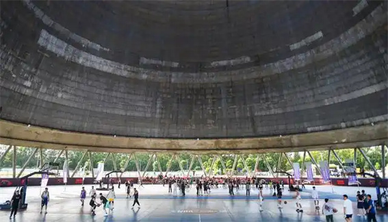 9月20日,市民在洛陽市洛龍區(qū)一處由廢棄冷卻塔改造的陽光里·工業(yè)游園籃球場內(nèi)進行體育運動。