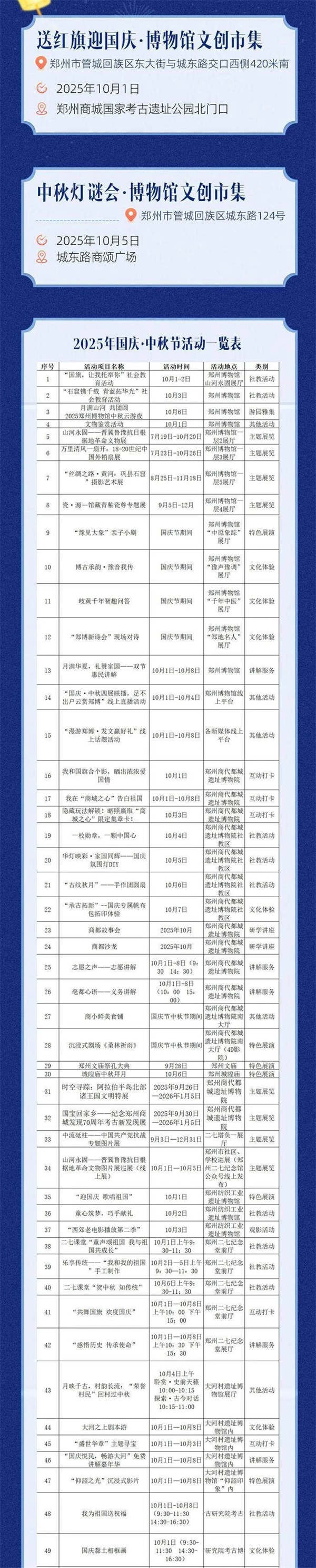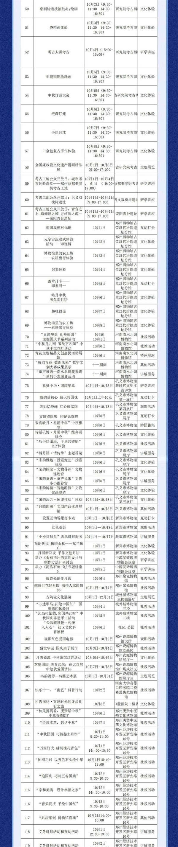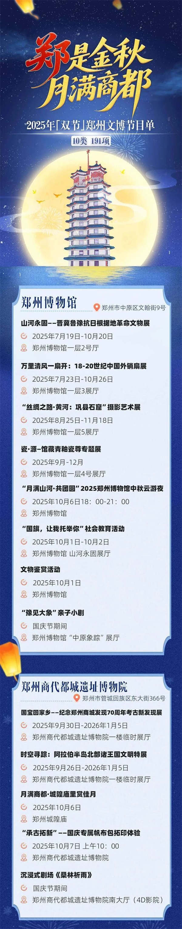 為切實(shí)滿足市民群眾的節(jié)日文化需求,充分展現(xiàn)鄭州作為“商都文化之城”的獨(dú)特魅力,今年國慶中秋假期,鄭州市文物局以“鄭是金秋 月滿商都”為主題,精心策劃了10類191項(xiàng)多彩紛呈的活動(dòng),為廣大市民群眾呈現(xiàn)豐富多彩的節(jié)日文化盛宴。