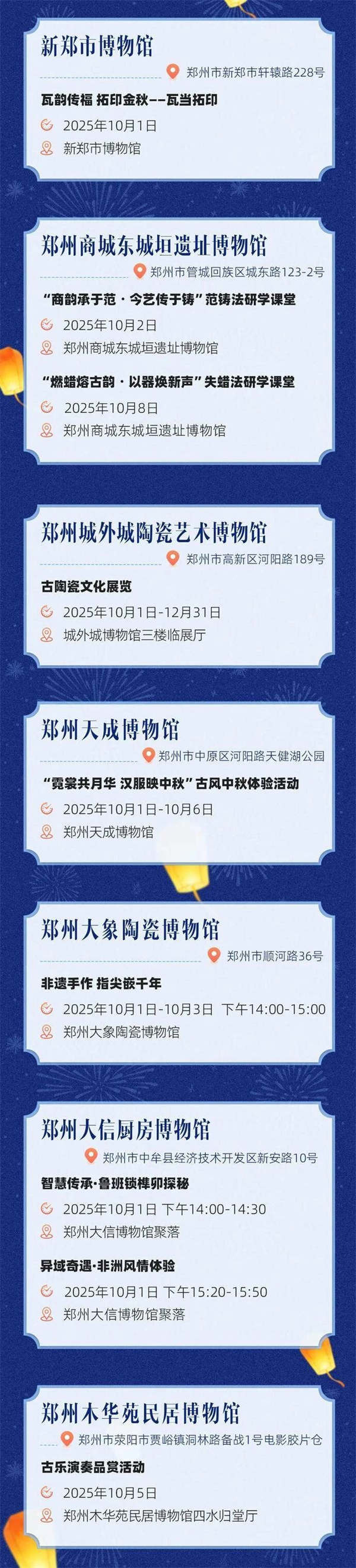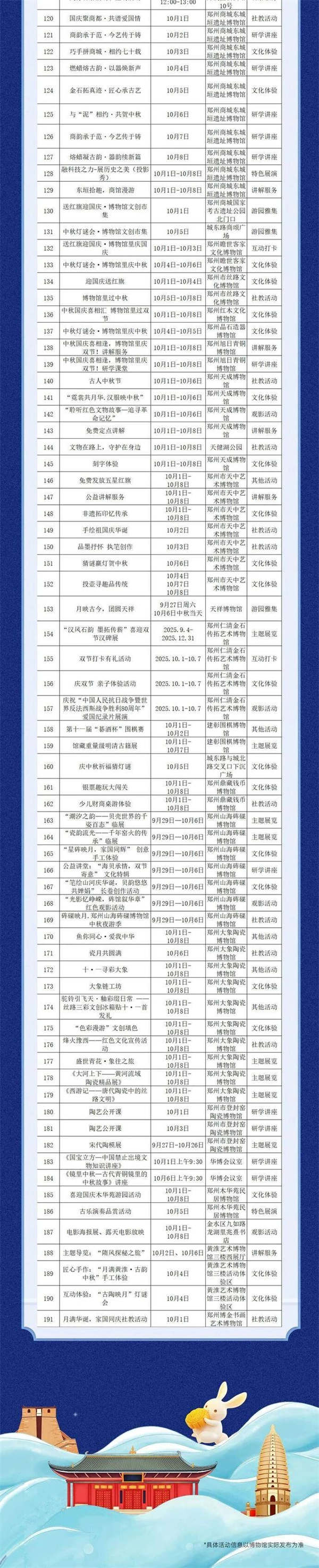 全市文博單位將推出10類191項(xiàng)活動(dòng),涵蓋19個(gè)主題展覽、16項(xiàng)講解服務(wù)、5個(gè)游園雅集、9項(xiàng)特色展演、49項(xiàng)文化體驗(yàn)、12項(xiàng)互動(dòng)打卡、40項(xiàng)社教活動(dòng)、20項(xiàng)研學(xué)講座、8項(xiàng)觀影活動(dòng)及13個(gè)其他活動(dòng),覆蓋鄭州博物館、鄭州商代都城遺址博物院等20余家重點(diǎn)文博單位,形成“展覽+體驗(yàn)+研學(xué)+宣傳”的立體活動(dòng)矩陣。
