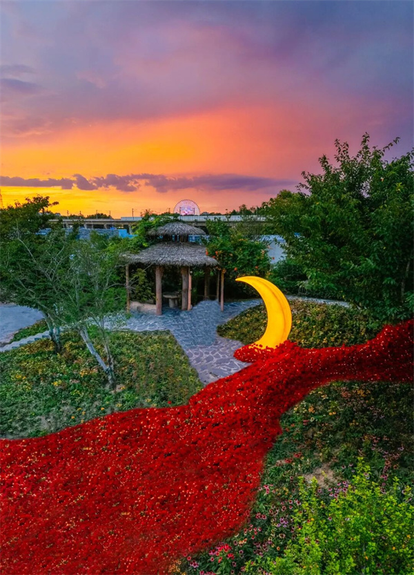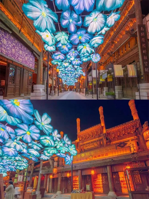 在【建業(yè)電影小鎮(zhèn)】,天光云影被朦朧的暮色溫柔接住,霓虹燈悄然亮起,為整條街蒙上一層復(fù)古的濾鏡。你與家人身著旗袍或長衫,漫步于《穿越德化街》濕潤的石板路上,仿佛走進了老月的流光碎影里。遠處,一彎月牙裝置靜靜置于前方,雖無朗月當(dāng)空,卻以另一種姿態(tài),呼應(yīng)著這個含蓄而深情的夜。