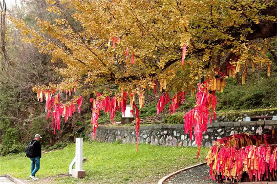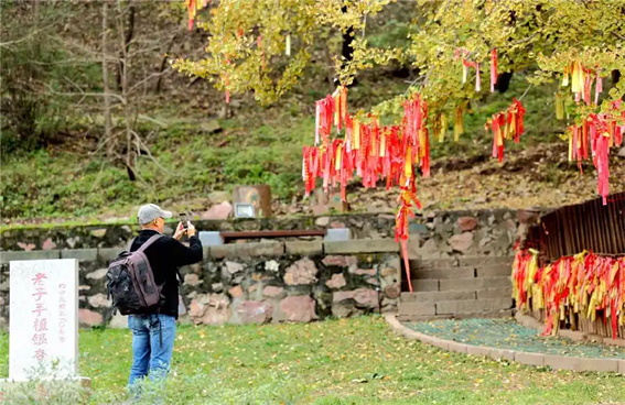 皸裂的樹皮紋理如歲月刻痕,粗糙卻滿含力量,與樹下輕擺的紅綢形成鮮明對比 —— 紅綢在鏡頭里化作流動(dòng)色塊,為蒼勁古木添上鮮活人文溫度。游客舉相機(jī)的身影,與古樹的偉岸形成趣味尺度對照,快門按下,便定格下人與樹、今與古的對話。