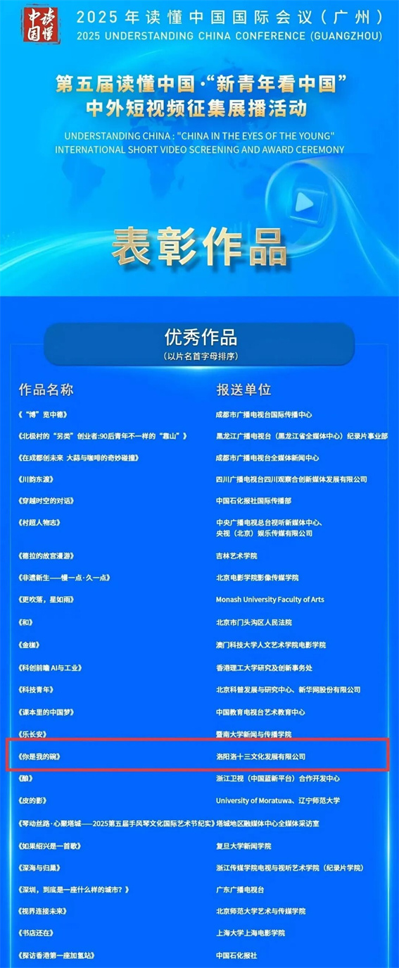 近日,從“讀懂中國·新青年看中國”中外短視頻征集活動組委會傳來喜訊,由洛陽洛十三文化發(fā)展有限公司出品,并在汝州市文化廣電和旅游局協(xié)作支持下 ,于我市多地取景拍攝的汝瓷主題短片《你是我的碗》(英文版名:You Are My Bowl),憑借其精巧的敘事、深厚的文化內(nèi)涵和卓越的國際傳播力,從來自全球數(shù)十個國家青年提交的數(shù)千份作品中脫穎而出,榮獲本屆活動“優(yōu)秀作品”獎。