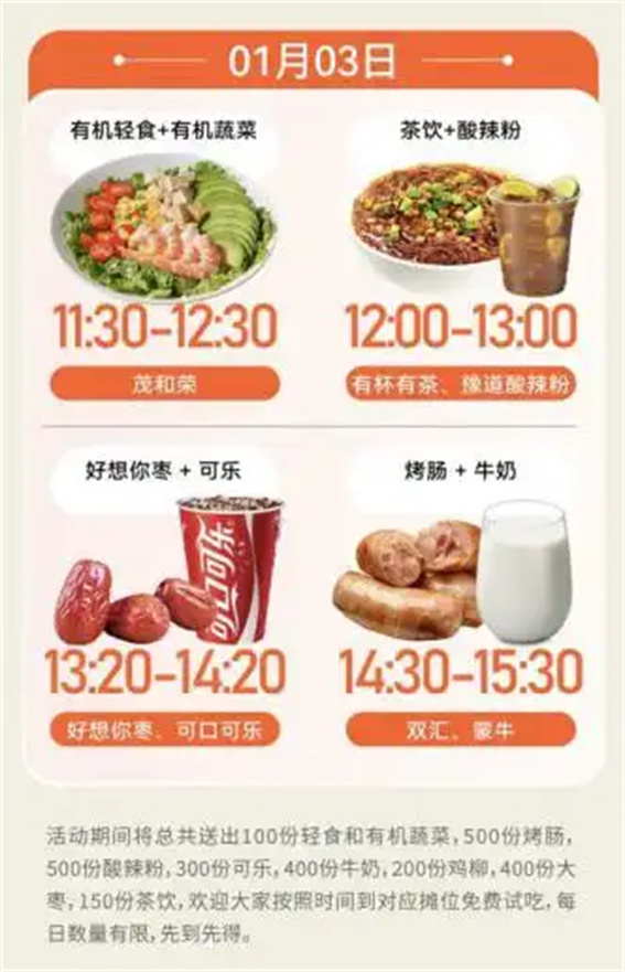 逛累了?雙匯、好想你、豫道酸辣粉、蒙牛、可口可樂、有杯有茶、茂和榮、堅(jiān)芽樂堅(jiān)果等知名品牌將在特定時(shí)段提供免費(fèi)試吃,打造舌尖上的驚喜時(shí)刻,具體時(shí)段請留意現(xiàn)場公告。