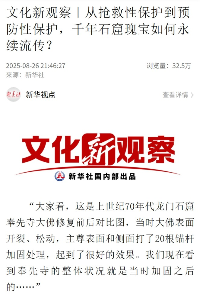 新華社推出多篇重磅報道,其中《智繪中國・世遺鏡鑒|數(shù)字技術讓龍門石窟“芳華永駐”》深度揭秘石窟數(shù)字化保護成果,通過超精建模、數(shù)字復位等技術手段,讓千年紋飾實現(xiàn)“數(shù)字永生”;《共同守護“壁上瑰寶”:“中國方案” 助力全球石窟寺保護研究》則聚焦2025石窟寺保護國際論壇,向世界傳遞中國石窟保護的先進經(jīng)驗。