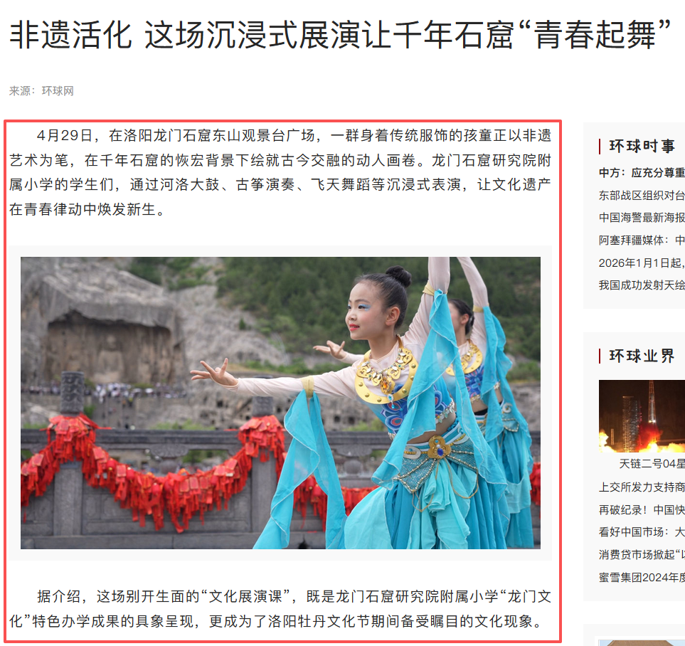 此外,央視新聞與中國日報等主流媒體也持續(xù)為龍門石窟的傳播賦能,如央視新聞《習近平河南行|干龕鄰峭壁瑰寶綻芳華一走進龍門石窟》一文中,以生動的圖文和視頻記錄,展現(xiàn)石窟的千年氣象與保護現(xiàn)狀;中國日報英文報道《Experts share extensive methods in conservation of cave temples》,以國際語言向全球推介龍門石窟的文化價值與保護實踐;環(huán)球網(wǎng)《非遺活化 這場沉浸式展演讓千年石窟 “青春起舞”》報道附屬小學沉浸式展演,展現(xiàn)文化傳承的創(chuàng)新形式;中國旅游報《守護文化瑰寶 擦亮自然珍寶》結合 “文化和自然遺產(chǎn)日”,深度分析龍門石窟文旅融合的發(fā)展路徑。