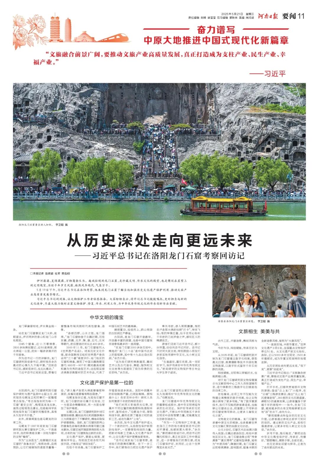 作為河南文化的 “金名片”,龍門石窟在省級媒體平臺同樣熱度不減。河南日報通過多角度、多形式的系列報道,全面展現(xiàn)了龍門石窟深厚的文化內涵與時代價值。例如,《潛心護瑰寶 龍門韻傳揚——習近平總書記在龍門石窟考察回訪記》一文,通過一線工作人員口述,還原考察現(xiàn)場的動人細節(jié)。