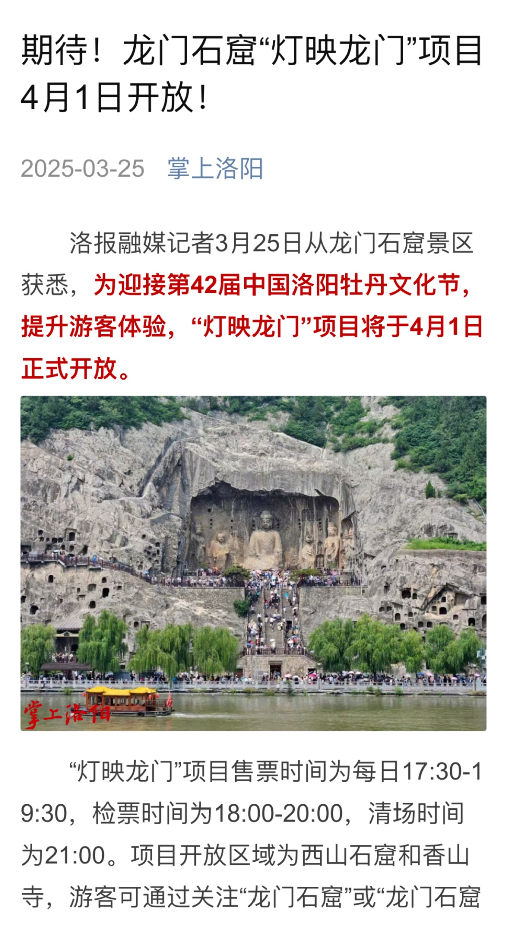 掌上洛陽客戶端緊扣大眾視角,生動呈現(xiàn)龍門石窟的服務創(chuàng)新與文旅體驗。例如,《期待!龍門石窟“燈映龍門”項目4月1日開放!》第一時間推送夜游新動態(tài),讓市民與游客實時感知光影賦予千年石窟的嶄新魅力。