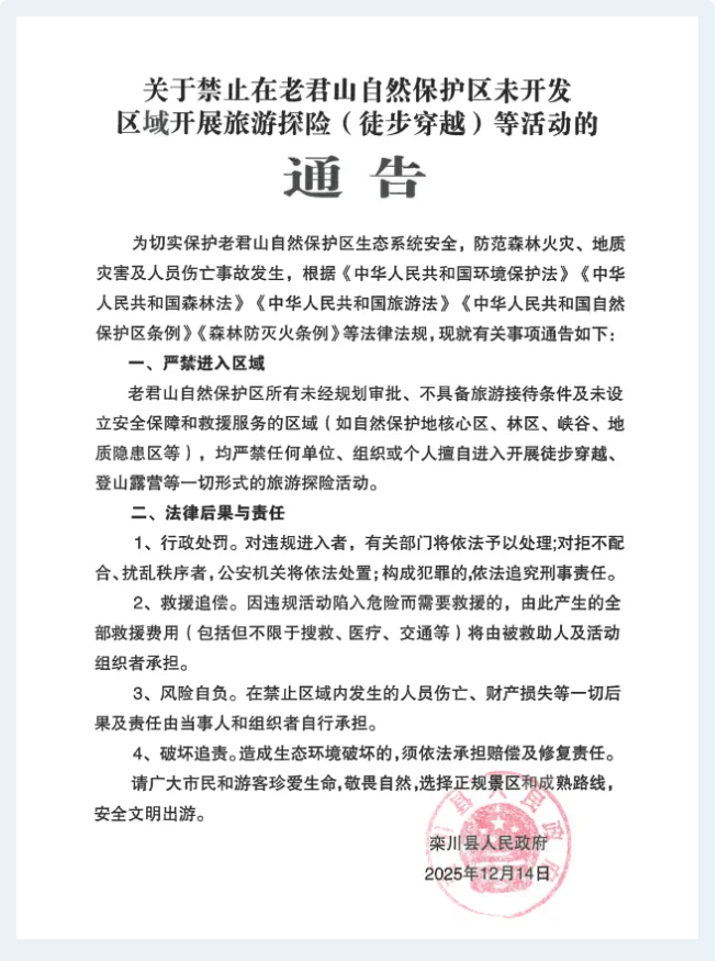關于禁止在老君山自然保護區(qū)未開發(fā)區(qū)域開展旅游探險(徒步穿越)等活動的通告