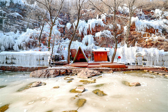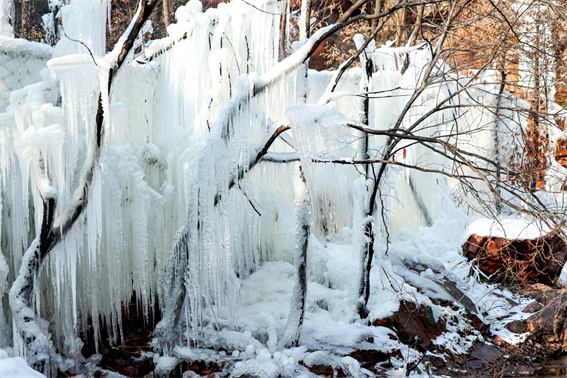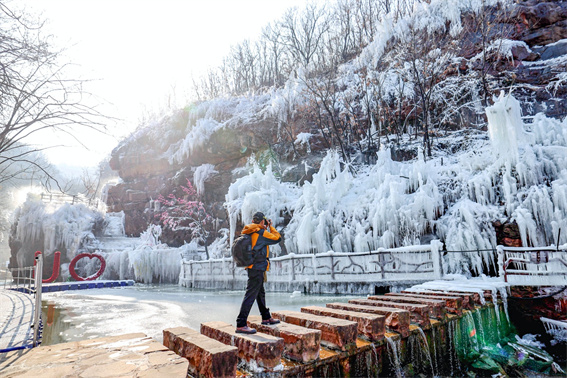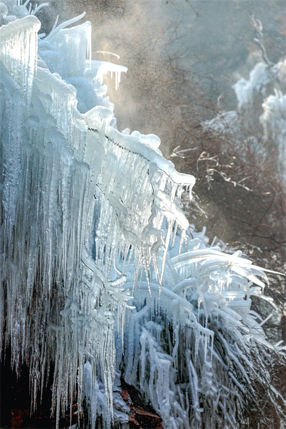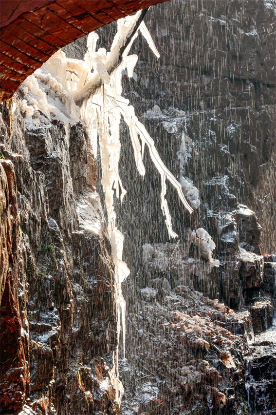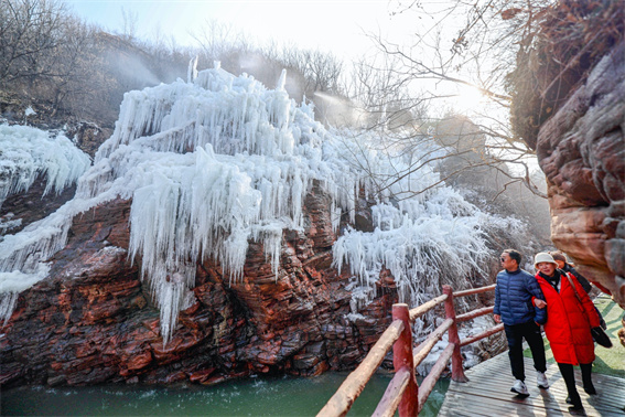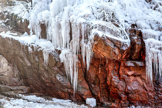 隨著氣溫走低,鄭州新密伏羲山景區(qū)的冬日限定美景已悄然上線:紅巖峭壁間,飛瀑流水凝結(jié)成層層疊疊的冰掛,似水晶流蘇垂落山間,成了今冬中原地區(qū)的“打卡熱地”。