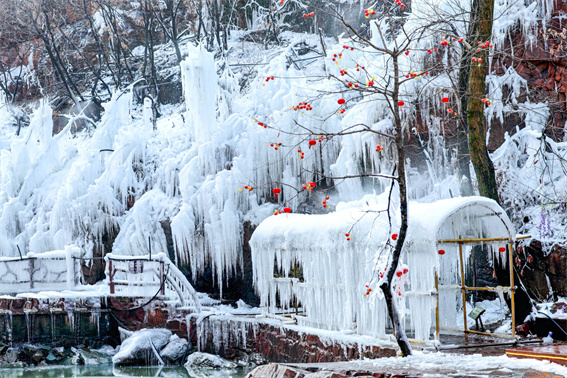 1月6日,記者在伏羲山景區(qū)看到,峽谷內(nèi)的巖壁、林木被晶瑩的冰掛包裹——長短不一的冰柱從崖壁垂落,陽光穿透時折射出細(xì)碎光斑;溪流旁的棧道邊,冰掛沿著樹枝舒展,連亭臺欄桿都覆上了“冰雪外衣”,搭配山間點(diǎn)綴的紅燈籠,冬日氛圍感拉滿。不少游客專程前來,或在冰掛下拍照留念,或沿步道漫步賞景,“紅巖配白冰,像走進(jìn)了童話里的水晶世界”。