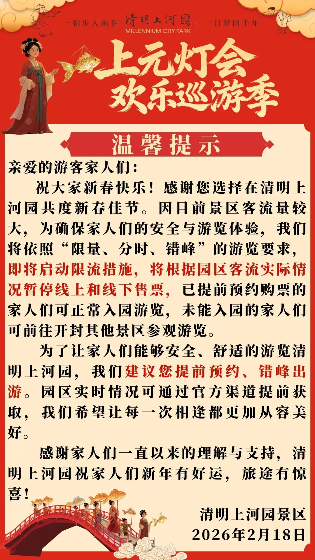 為答謝游客家人們對清明上河園的厚愛,清明上河園在春節(jié)期間入園的家人們準備了一份特別的心意:凡正月初一至初五入園的游客,可在2026年3月1日至31日期間憑本人身份證免費重游!