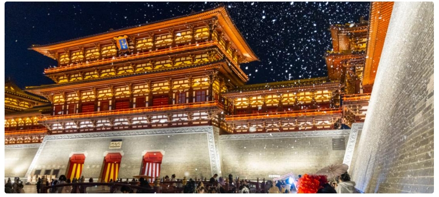 應天門遺址博物館;2月15日至2月23日每晚19:00、20:00各一場,每場20分鐘;應天門二層平臺上演人工“降雪”,漫天“雪花”勾勒盛唐建筑,營造穿越千年的浪漫夜景。