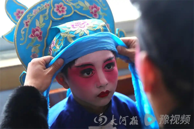 為了這場表演,耿諾一早上8時就跟隨父親來到會內,化妝、扮相、勒腿。雖然年紀小,但他已是“老戲骨”。“我爸、我叔、我爺爺都會踩高蹺,小時候看著很威風、很帥,我就跟著爸爸學了。”耿諾一說。
