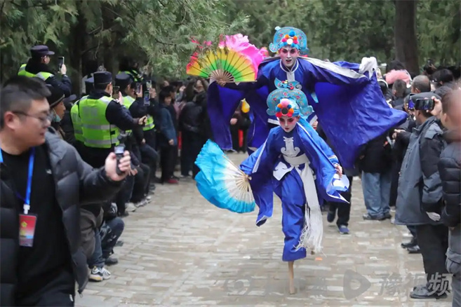 13時30分許,東后街社火隊的出現將文治閣的氣氛推向高潮。高蹺隊員在歡呼聲中表演了前空翻、后空翻等高難度動作。壓軸出場的則是耿曉孟與耿諾一父子聯(lián)袂表演的《撲蝶》,兩人動作協(xié)調一致,靈動傳神,現場叫好聲不斷。