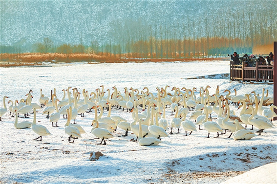 冬季,雪后的三門(mén)峽市后地天鵝灣,雪地鵝影,浪漫邂逅。攝影愛(ài)好者、游客紛紛前來(lái)打卡留影。劉澇慈 攝