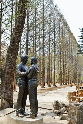 南怡島是《冬季戀歌》取景最多的地方之一。處處是草地和漫步小道。姜俊尚(裴勇俊)和鄭維珍(崔智友)就曾幸福的徜徉于白樺林之間。