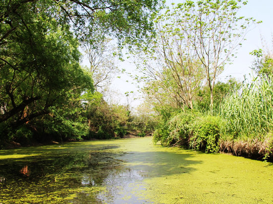 原生態(tài)的漁灣水道,因交通閉塞而得以保存。這里河網(wǎng)密布,港叉縱橫。河水清且漣漪,枝頭百鳥相鳴;港邊蘆葦飄曳,岸旁雜樹生花;春來(lái)簇簇似錦,夏至蔭 蔭如蓋,秋到荻花茫茫,冬臨雪飛魚藏。河曲、樹繁、草茂、鳥多,水情、境幽,是這塊濕地的六大特色。舟行水巷之中,自有“山窮水盡”之惑,“柳暗花明”之 趣,從而識(shí)得自然“真、善、美”之三味。