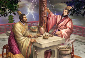 有一天,劉備應(yīng)曹操的邀請來青梅亭作客,曹操設(shè)宴款待。盤置青梅、金斝煮酒,二人對坐,淺斟慢飲,暢談天下大勢。這時忽然天色變暗,雷閃大作,一場大雨即將來臨。曹操一時豪氣勃發(fā),長聲對劉備說:“使君知道龍的變化嗎?”于是,二人從龍的變化談到天下英雄。曹操問劉備:“誰是當(dāng)今天下英雄?”劉備說:“我在明公門下,每日種菜澆水,天下英雄之事,實在不知!辈懿僬f:“不知其面,應(yīng)聞其名呀!”