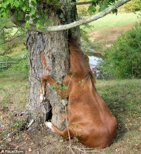 誰也不知道格雷西是怎么把腦袋擠進這個樹洞的 這件趣事發(fā)生在美國西弗吉尼亞州的一個小鎮(zhèn),那天小馬格雷西在一個農(nóng)場里瞎轉(zhuǎn)悠。據(jù)救它出來的農(nóng)戶杰森說,不知道為什么格雷西對這個樹洞起了好奇心,想要一窺究竟,于是就使勁把腦袋擠了進去,可惜進去容易出來難,格雷西就這樣被卡在了那兒,動彈不得。