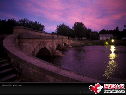 1、在澳大利亞的塔斯馬尼亞,古橋羅斯橋籠罩在紫紅色的日落中。這座美麗的沙巖跨橋是由囚犯們在1836年建造而成,也是澳大利亞最古老的橋梁之一。橋上有精美的雕刻飾物。