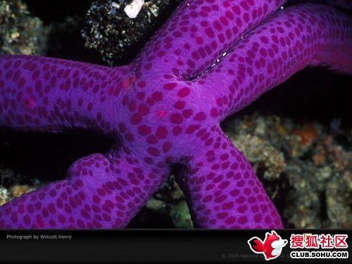 6、這只海星閃耀著漂亮的紫色,是在印度尼西亞的蘇拉威西島附近的水域里拍攝到的。盡管它們的英文名是“starfish”(“fish”在英文中是“魚”的意思,“star”是“星星”的意思),但這些動(dòng)物卻不是魚。它們是棘皮類動(dòng)物,和海膽家族的關(guān)系很近。