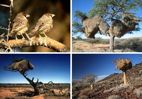 300多對織布鳥在一起能夠建造一個25英尺寬、5英尺高,為每對織布鳥提供獨立住所的集體公寓。作為一個龐大復雜的“公寓樓”,它們有多個通道直抵各自的房間。