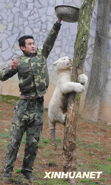 2月17日,在貴陽森林野生動物園,“銀虎”和飼養(yǎng)員在一起。新華社記者楊楹攝
