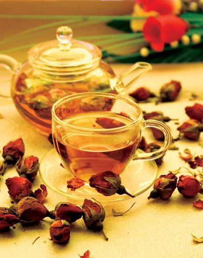 制作:選取玫瑰花干花蕾4-5顆、薄荷少量。將干玫瑰花與薄荷一同放入杯中,加蓋到10~15分鐘,待茶涼后飲用提神效果更佳。