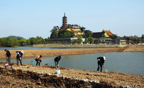 4月17日,工人在江蘇鎮(zhèn)江千年古剎金山寺下的金山湖景區(qū)進行改造施工。江蘇鎮(zhèn)江以整體水質改善和水生態(tài)修復為目標,投資9億元,對1.08平方公里的金山湖景區(qū)進行整治,修復金山湖生態(tài),屆時將重現“水漫金山”、“白蛇島”等景觀。目前,工程施工進展順利。新華社發(fā)