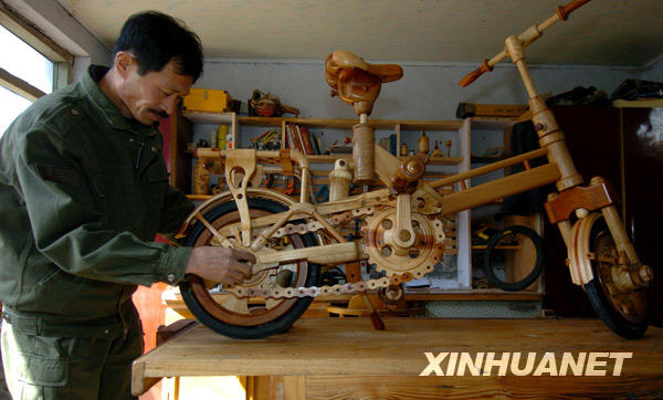 今年52歲的遼寧省鐵嶺市清河區(qū)貨郎屯農(nóng)民孫立學(xué),經(jīng)過(guò)3個(gè)月的研制,制作出一輛除軸承、輪胎等零件外,大部分由木頭做成的自行車。車高95厘米,重量16公斤,可承載近200斤的重量。新華社記者 姚劍鋒 攝