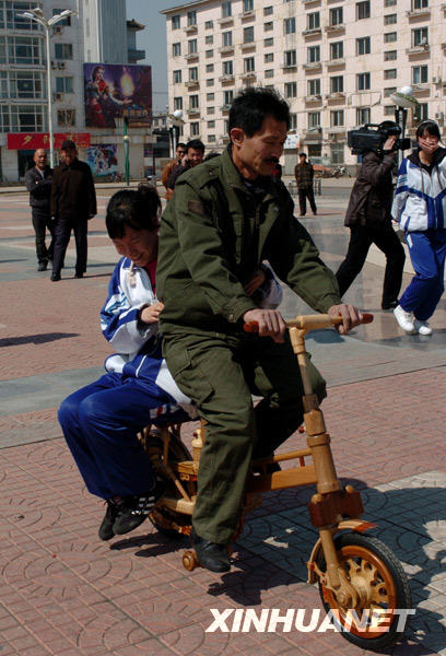 4月2日,孫立學(xué)載著一名中學(xué)生,試騎木制自行車。新華社記者 姚劍鋒 攝