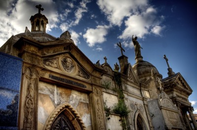 去參觀布宜諾斯艾利斯,瑞克萊塔公墓總是首選之地。它在阿根廷歷史上可謂是非常迷人的。最著名的墳?zāi)狗且镣夼崧≈鼓獙佟T谀抢镞有很多阿根廷的政治家,詩人和其他的名人。這個墓地設(shè)計的像一個城市,在那里有寬闊的大道以及錯綜的小徑,在其兩旁,都是一些家族或個人的“房子”。有許多墓都維持的非常好,然而也有很多墓穴因?yàn)闆]有家族沿襲下來而年久失修。有很多地穴被作為維修的小室。而清潔用的工具被放在靈柩的上面。在那些有人維修的墓穴中,你會發(fā)現(xiàn)有很多雕塑品已經(jīng)是國家的歷史性紀(jì)念碑。這些雕塑,從埃及金字塔到哥特式再到現(xiàn)代裝飾藝術(shù)有很多不同的風(fēng)格。另外一個有趣的注釋:你可能在那里發(fā)現(xiàn)一種野生的很兇狠的貓僑居在瑞克來塔墓地里,當(dāng)?shù)厝私?jīng)常給它們食物。