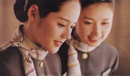 一向尊重服飾質(zhì)感剪裁的韓國將其特色滲透在航空小姐的制服上。別致的制服和獨特的系扣絲巾搭配在一起,嚴謹而又不單調(diào)。收起的頭發(fā)清新整潔,倍增親切感。
