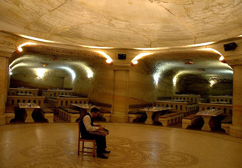 土耳其卡帕多奇亞除了地面上的奇峰異石,地下的美景也同樣獨(dú)特。這個(gè)奇特地方最著名的是地下城,36座大大小小的地下城遍布這一地區(qū),那巨大的隧道迷宮、洞穴和通道有七八層之多。公元初逃難的基督徒在地下的建筑,一樣精美而充滿情調(diào)。排氣管、逃生通道周密的安排好了,教堂的墻壁上繪滿了基督教圖畫,有些斑駁,但仍然色彩飽滿,形象生動(dòng)。